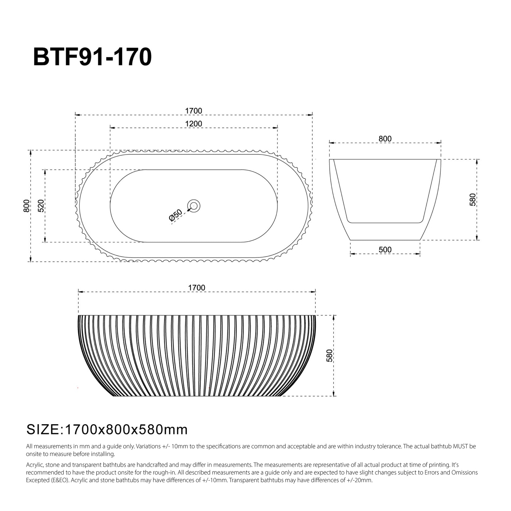 * Acrylic, stone and transparent bathtubs are handcrafted and may differ in measurements. The measurements are representative of all actual product at time of printing. It's recommended to have the product onsite for the rough-in. All described measurements are a guide only and are expected to have slight changes subject to Errors and Omissions Excepted (E&EO). Acrylic and stone bathtubs may have differences of +/-10mm. Transparent bathtubs may have differences of +/-20mm.