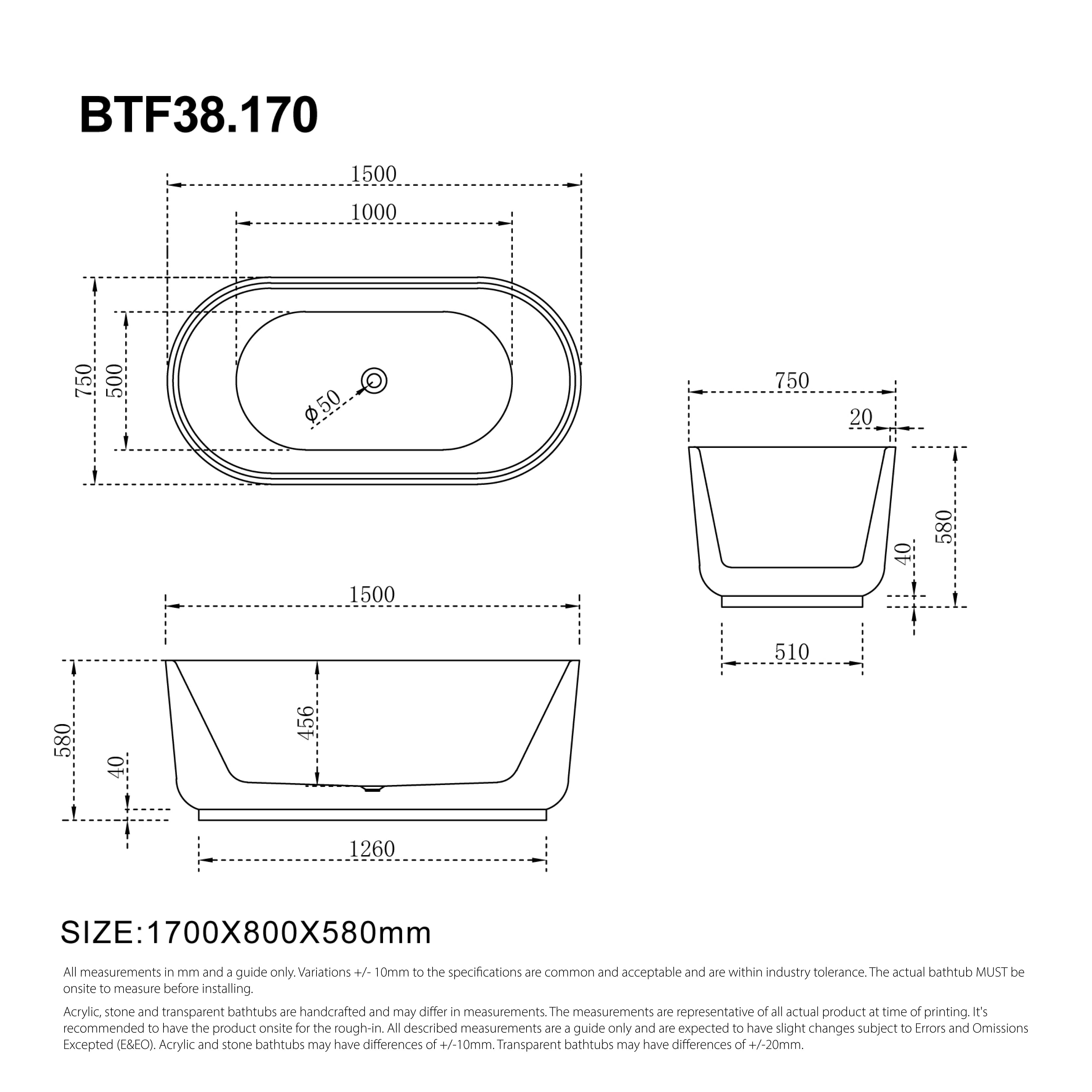 * Acrylic, stone and transparent bathtubs are handcrafted and may differ in measurements. The measurements are representative of all actual product at time of printing. It's recommended to have the product onsite for the rough-in. All described measurements are a guide only and are expected to have slight changes subject to Errors and Omissions Excepted (E&EO). Acrylic and stone bathtubs may have differences of +/-10mm. Transparent bathtubs may have differences of +/-20mm.