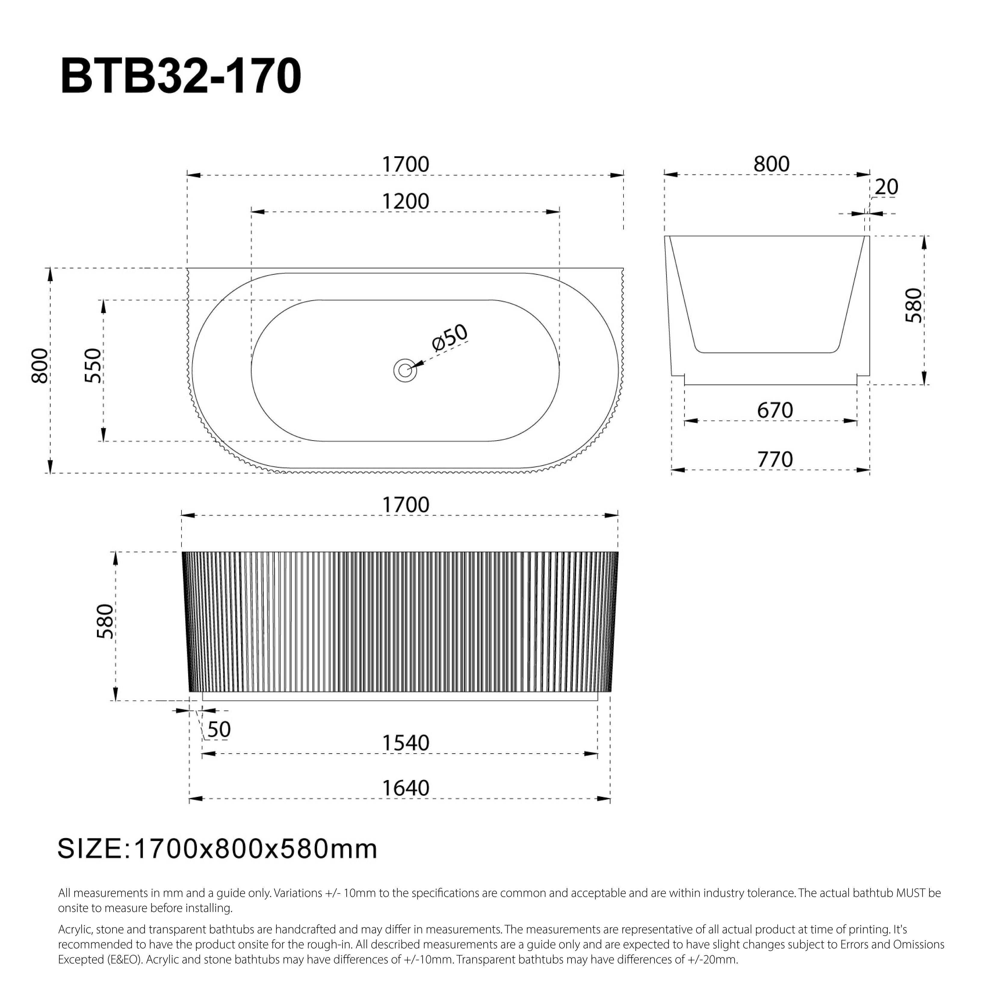 * Acrylic, stone and transparent bathtubs are handcrafted and may differ in measurements. The measurements are representative of all actual product at time of printing. It's recommended to have the product onsite for the rough-in. All described measurements are a guide only and are expected to have slight changes subject to Errors and Omissions Excepted (E&EO). Acrylic and stone bathtubs may have differences of +/-10mm. Transparent bathtubs may have differences of +/-20mm.