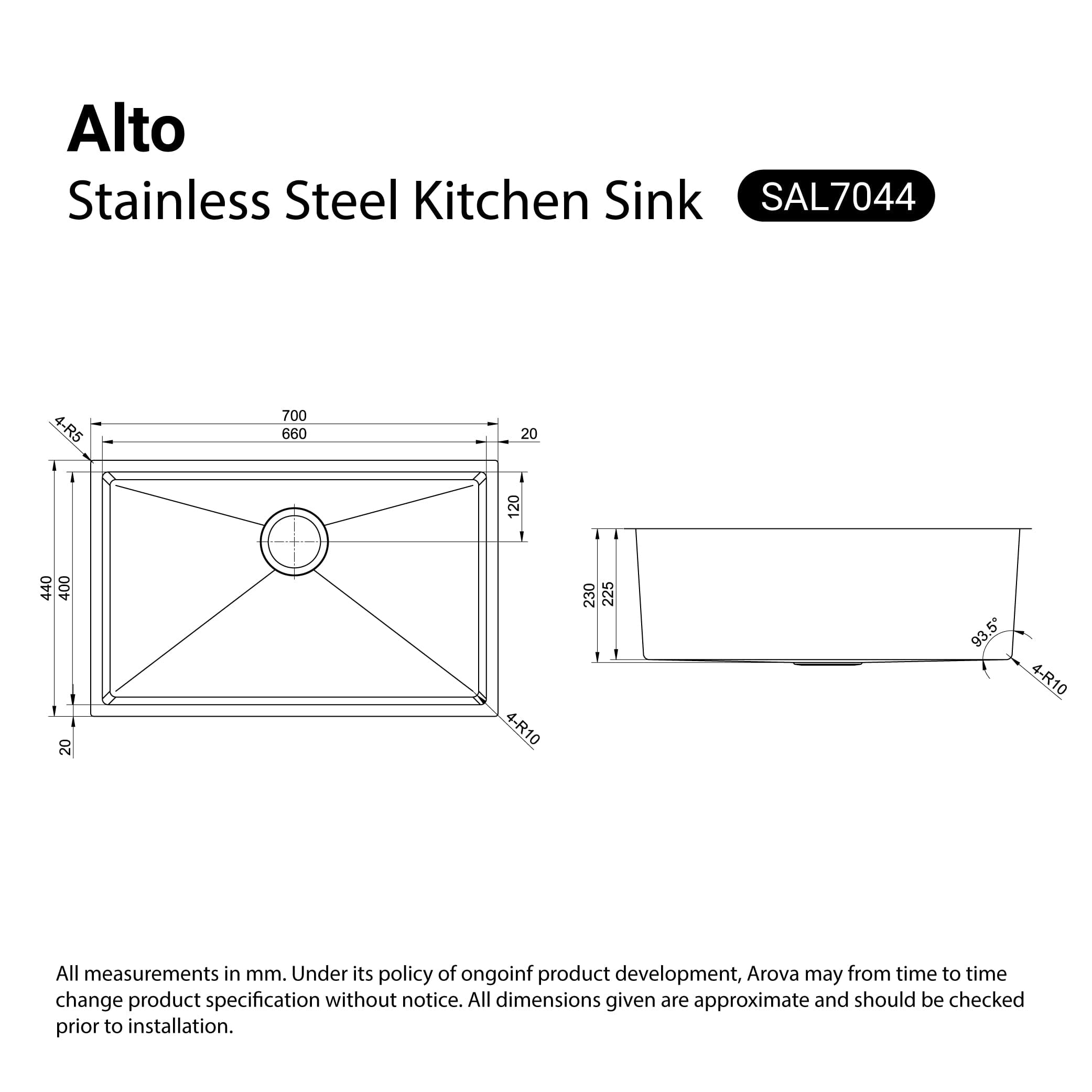 The 700mm ALTO 304 stainless steel single bowl kitchen sink offered by Arova is a compact yet powerful sink. Made from a single piece of 1.0mm thick premium 18/10 stainless steel, handcrafted with 10mm radius corners for easy cleaning and then finished with the finest satin look, the ALTO 59L sink is packed with quality, style, practicality, and maximum durability. The Alto 700mm length stainless steel square kitchen sink offers 2-way installation - countertop and under-mount with clips and templates included for both applications.
